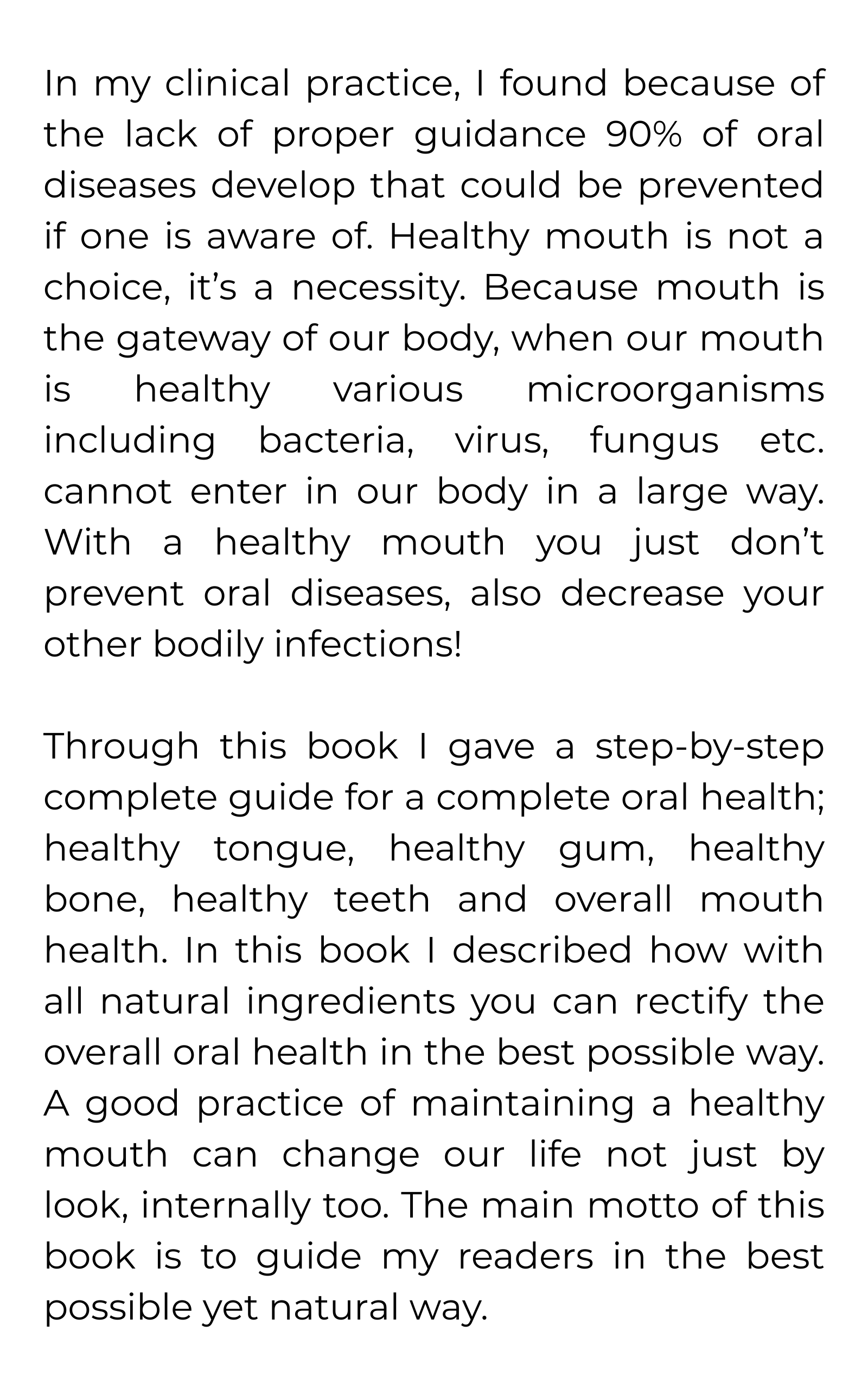 Through this book I gave a step by step complete guide for a complete oral health; healthy tongue, healthy gum, healthy bone, healthy teeth and overall mouth health. In this book I described how with all natural ingredients you can rectify the overall oral health in the best possible way. A good practice of maintaining a healthy mouth can change our life not just by look, internally too. The main motto of this book is to guide my readers in the best possible yet natural way.